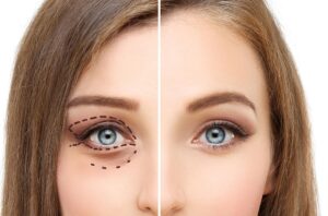 Lower Blepharoplasty.Upper blepharoplasty.Marking the face.Perforation lines on females face, plastic surgery concept. Fanette Mothé 15 marzo 2021